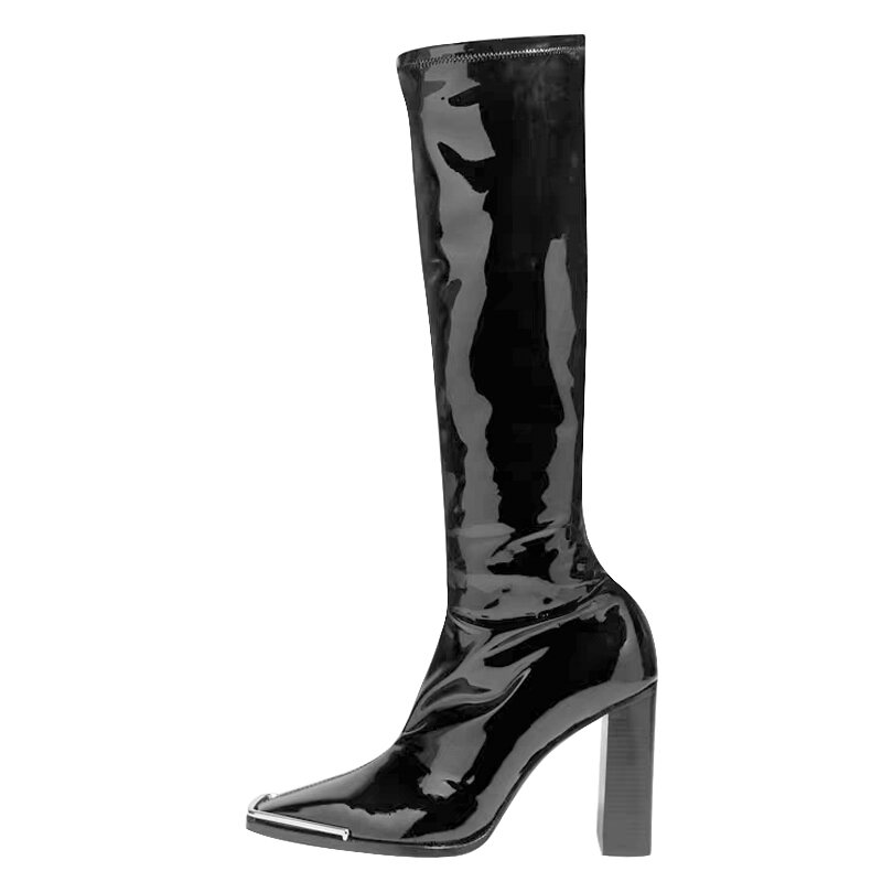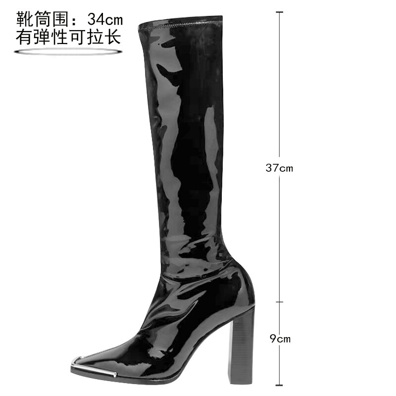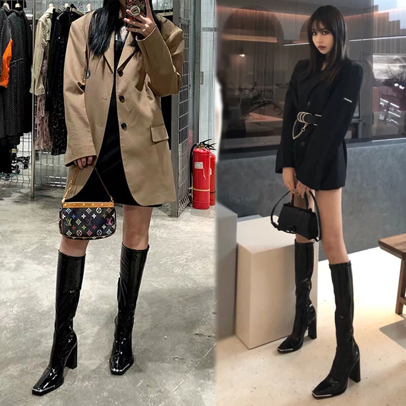 Kendall Same Style European and American High Heel Square Toe Boots Female below the Knee British Style Patent Leather Bag Leg High Leg Boot Female Chunky Heel