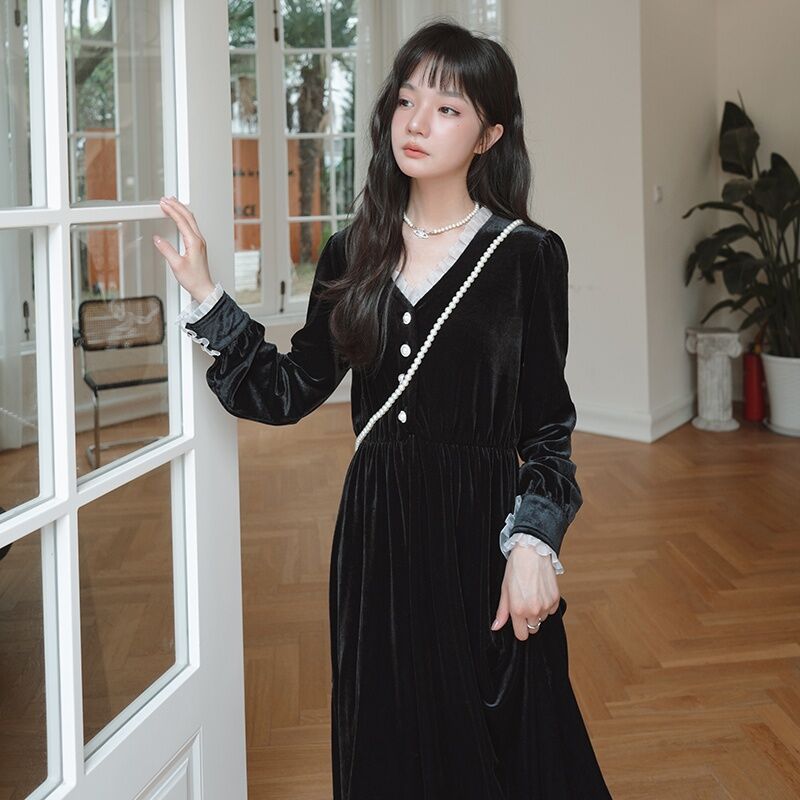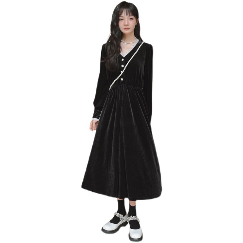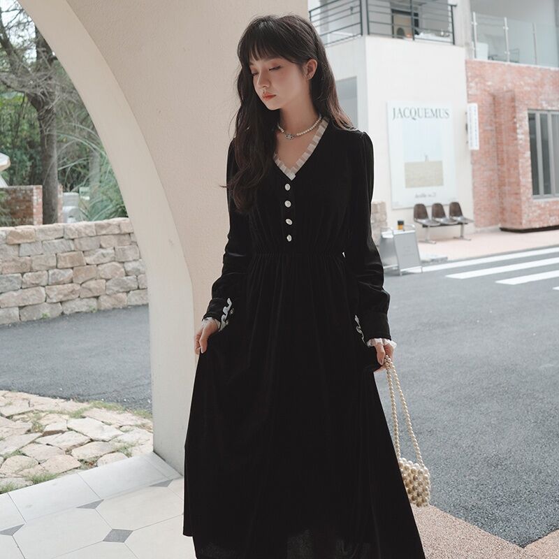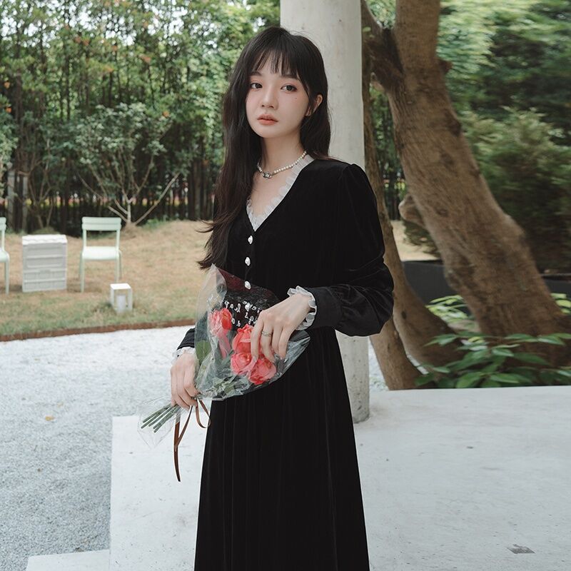 Black Retro High end Hepburn Style Dress Women's Fall 2023 V-neck Lace Temperament Waist Hugging Slimming Skirts