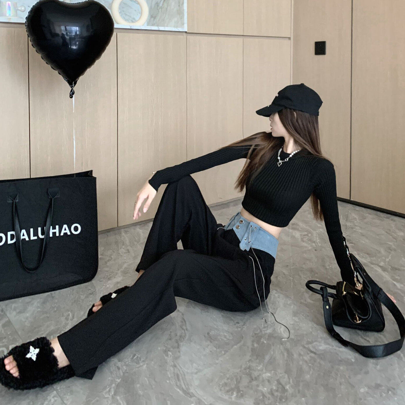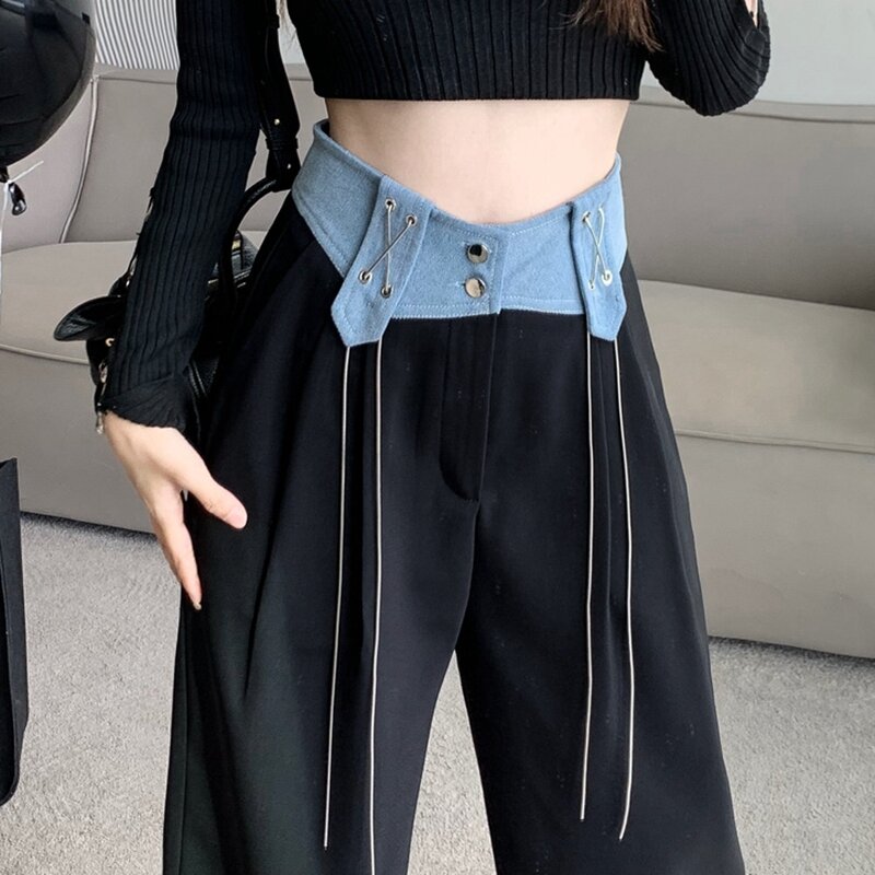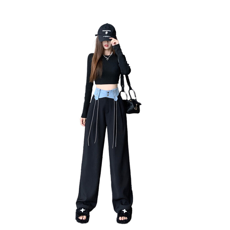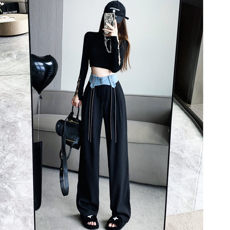 Design Denim Stitching Wide-Leg Pants Women's High Waist Drooping 2022 Autumn New Loose Slimming Casual Mopping Pants