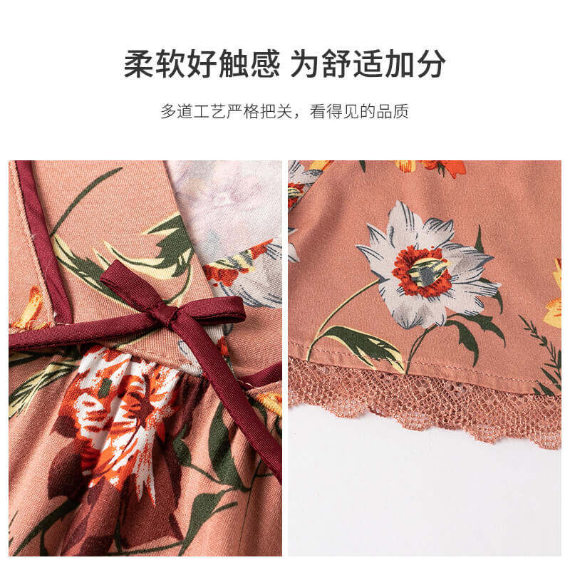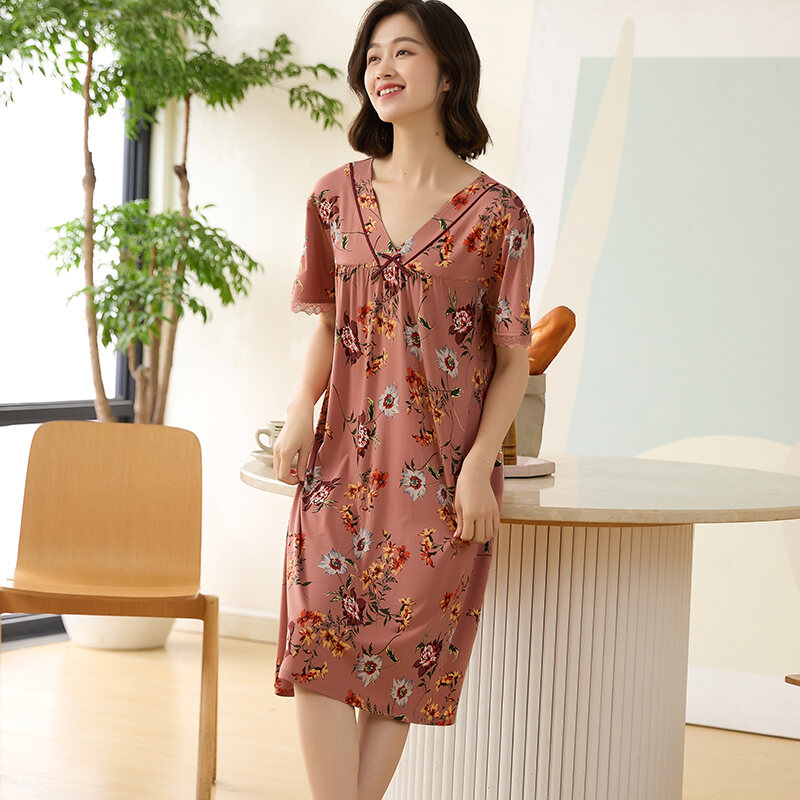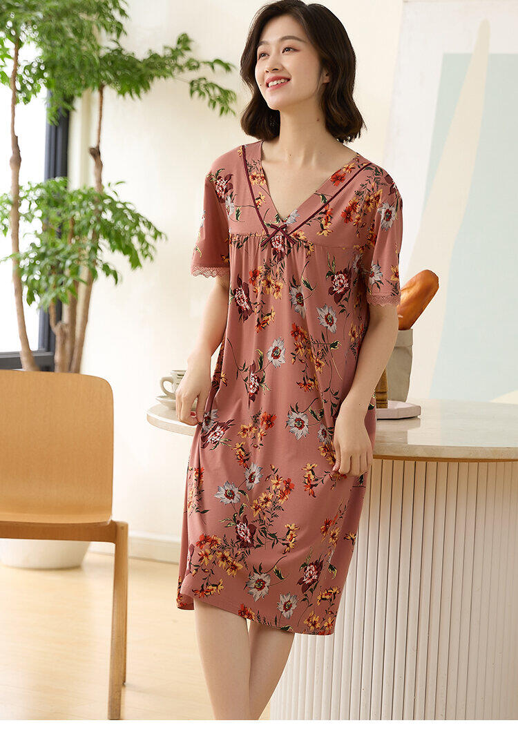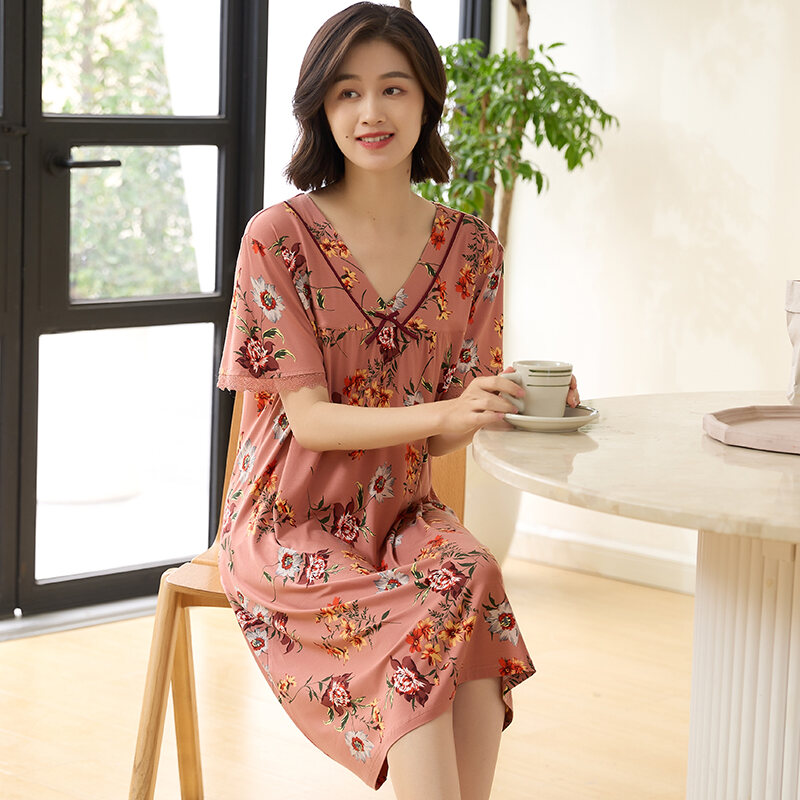 Modal Short-Sleeved Thin Nightdress Women's Summer Printed V-neck Casual Homewear Middle-Aged Mother Loose Large Size