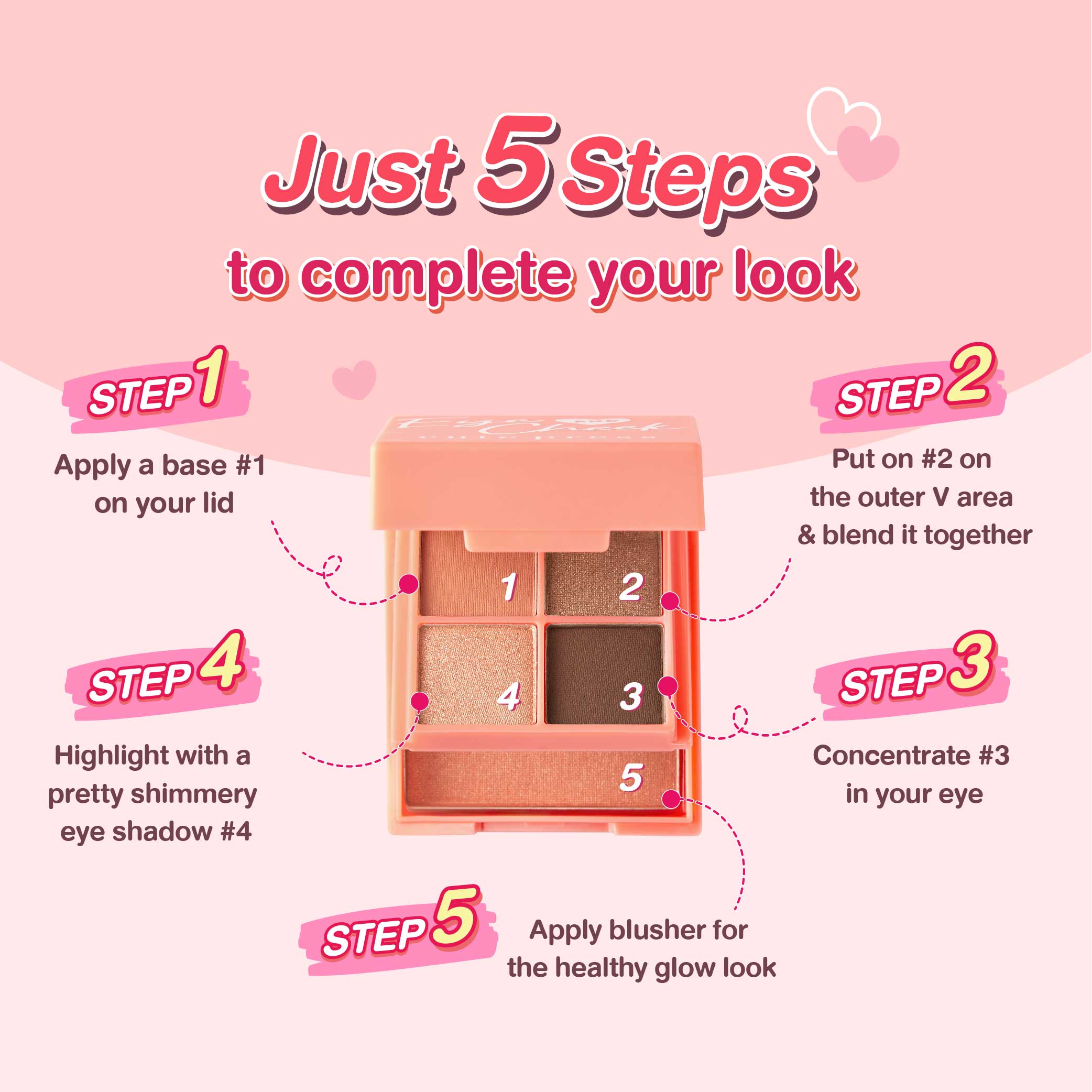 This travel-size eye and cheek palette lets you create a complete makeup look anywhere, anytime. It comes with matte and shimmer eye shadow and a blush color that perfectly matches the eye colors. Each shade is highly pigmented and lasts all day long. - All-in-one eye shadows & brusher in mini-size. - Complete the look with both matte & shimmer texture. - Highly pigmented that stays true all day long. - 5 Gorgeous shades that suit any occasion.