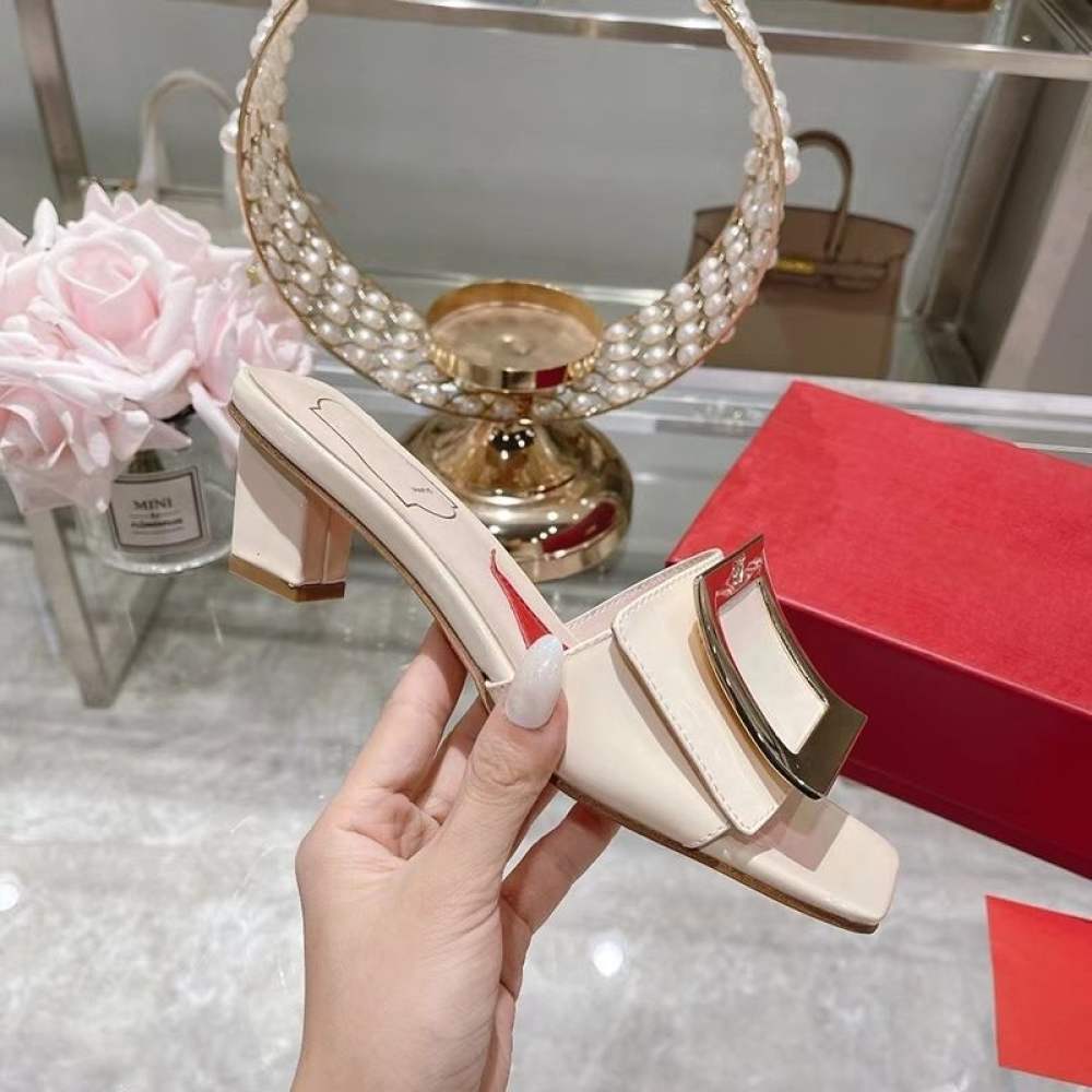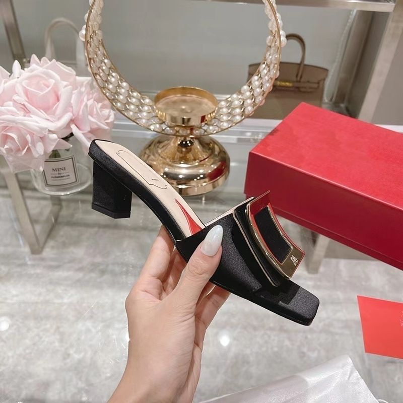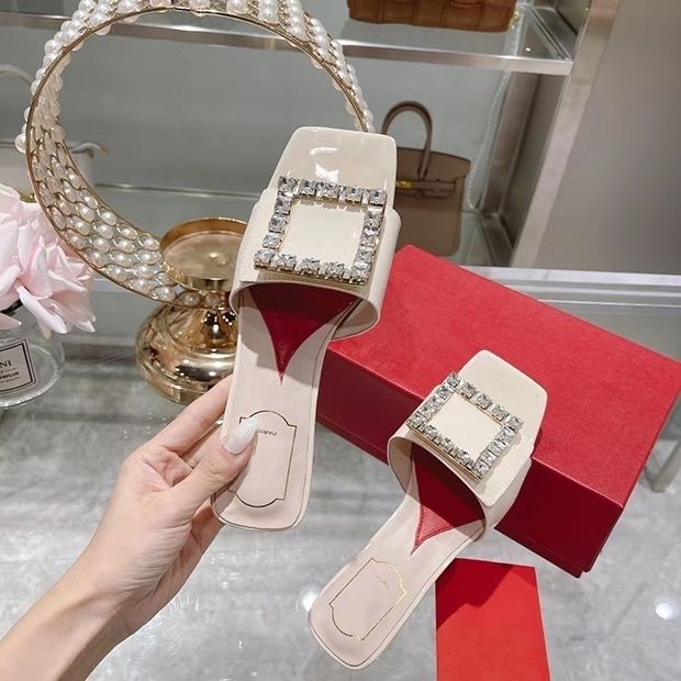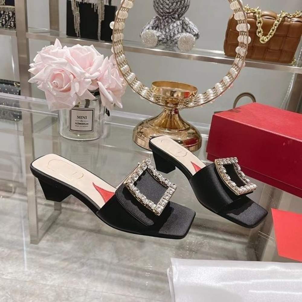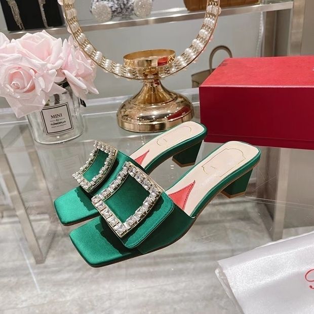 2022 Summer Roger vivierˉNew Fashion Women's Shoes Coarse Heel Slippers High Heel Diamond Button Women's Shoes