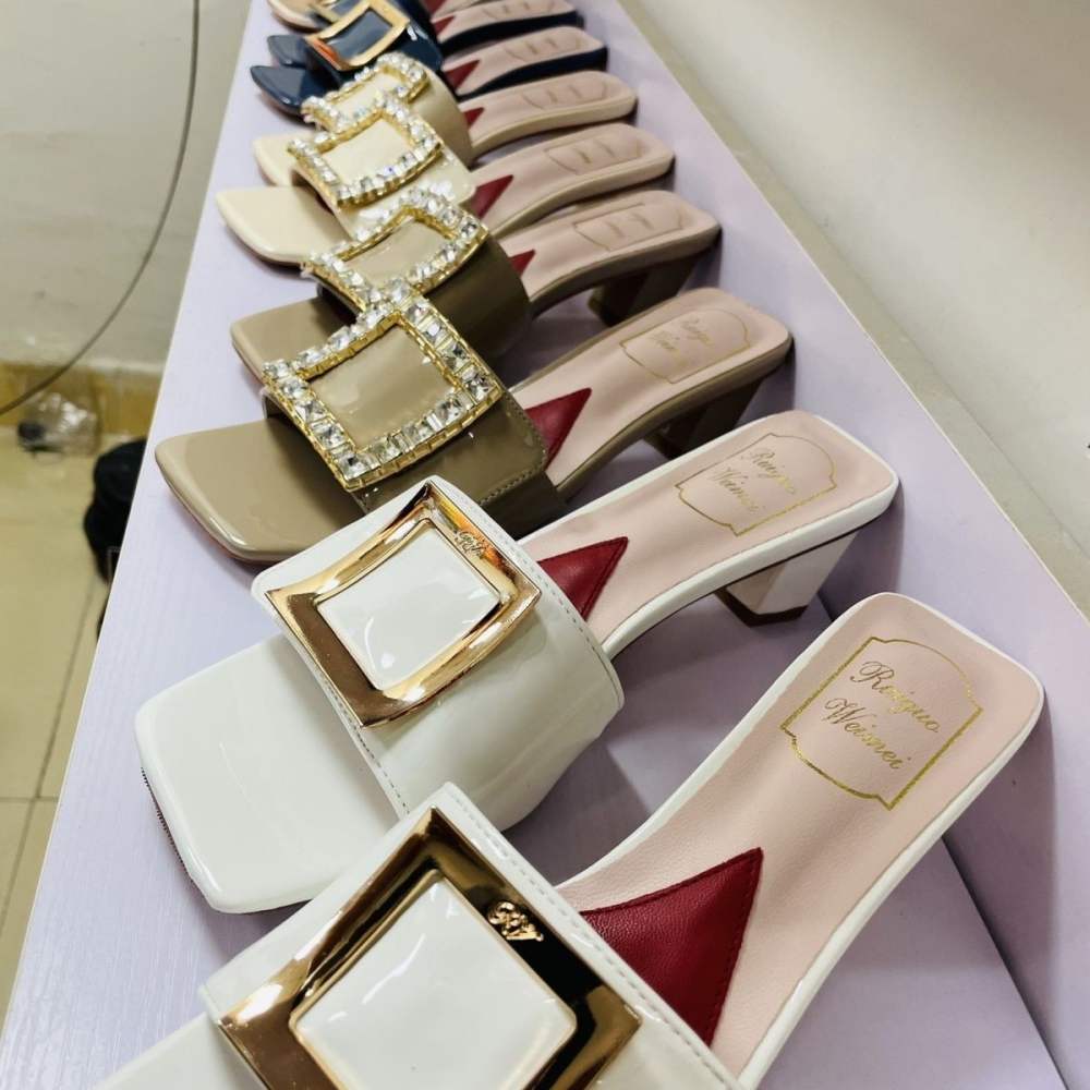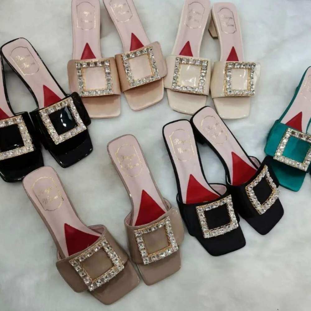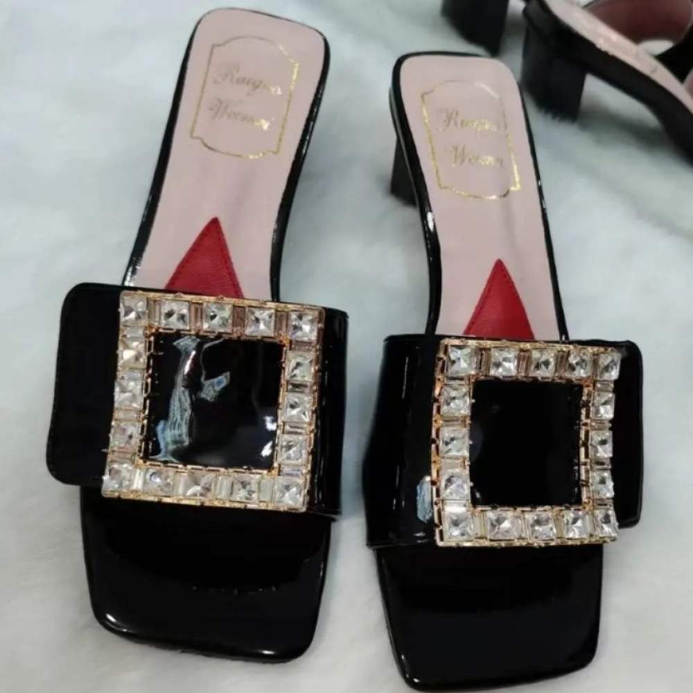2022 Summer Roger vivierˉNew Fashion Women's Shoes Coarse Heel Slippers High Heel Diamond Button Women's Shoes