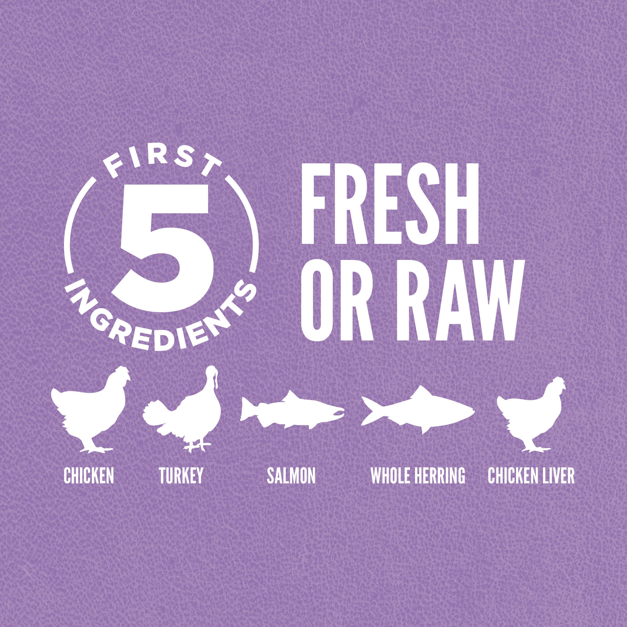 • The first 5 ingredients are fresh or raw poultry and fish ingredients. Our fresh ingredients use refrigeration as the sole method of preservation and our raw ingredients are frozen at their peak freshness.