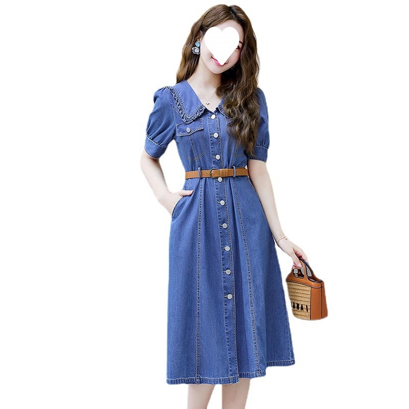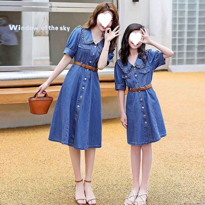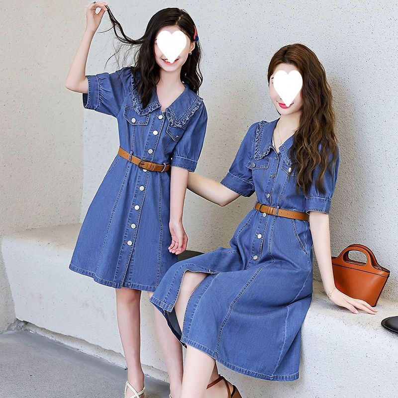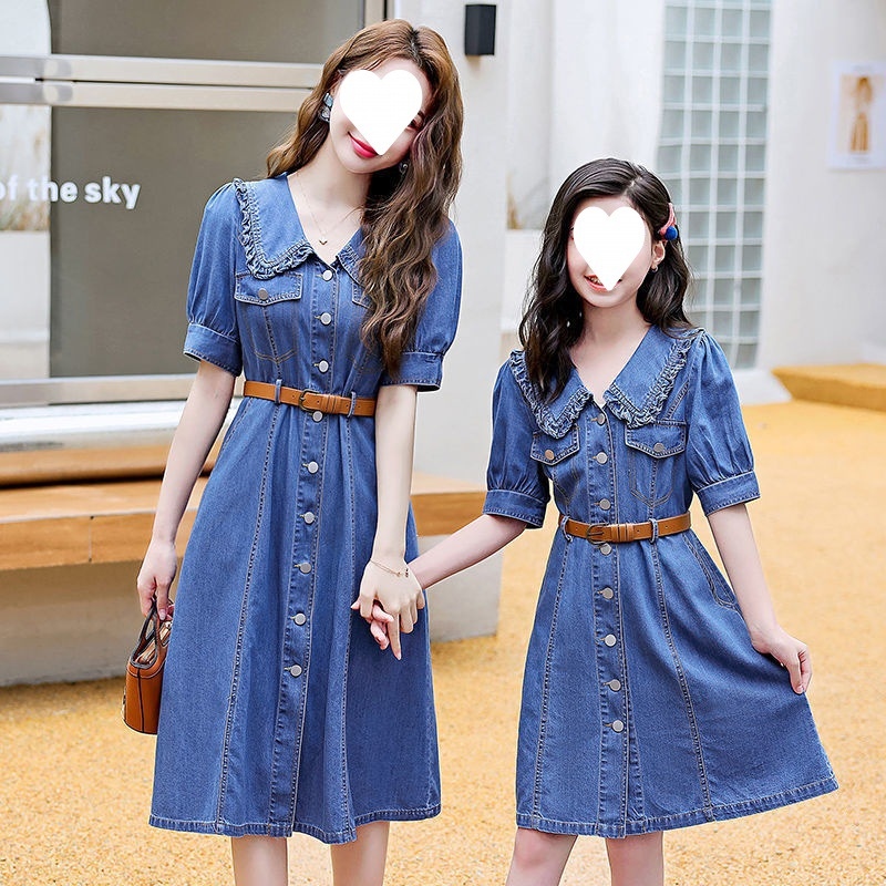 Denim suit high-end parent-child dress 22 summer new m-ughter dress western style slim waist summer dress C423¤▽