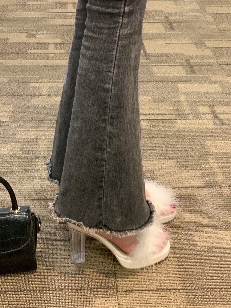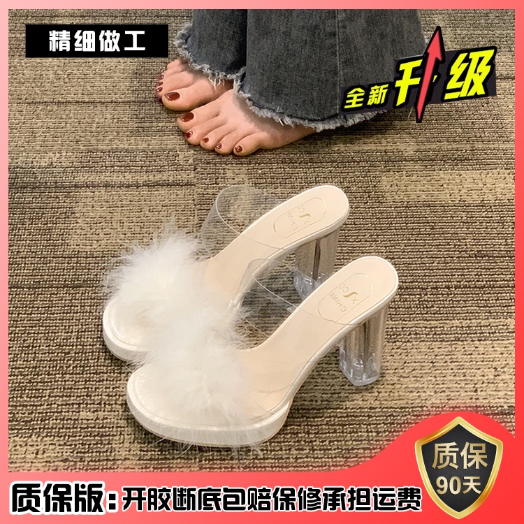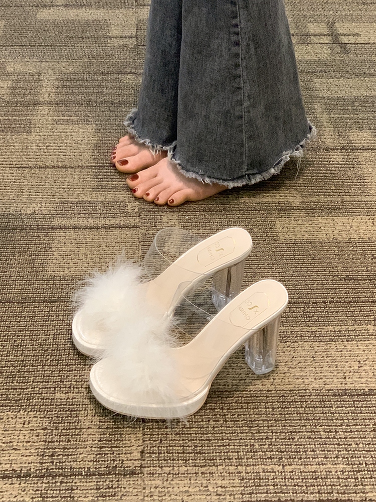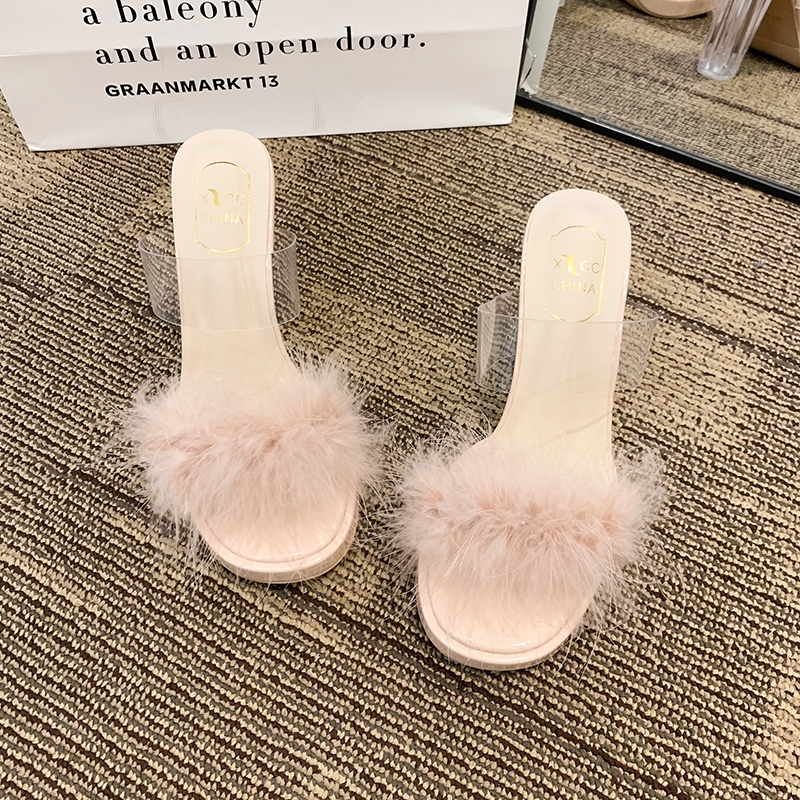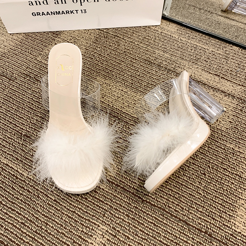 Internet Celebrity Fairy Style Furry Slippers for Women Summer Outdoor Wear 2023 New Crystal Heel Chunky Heel High Heel Slippers