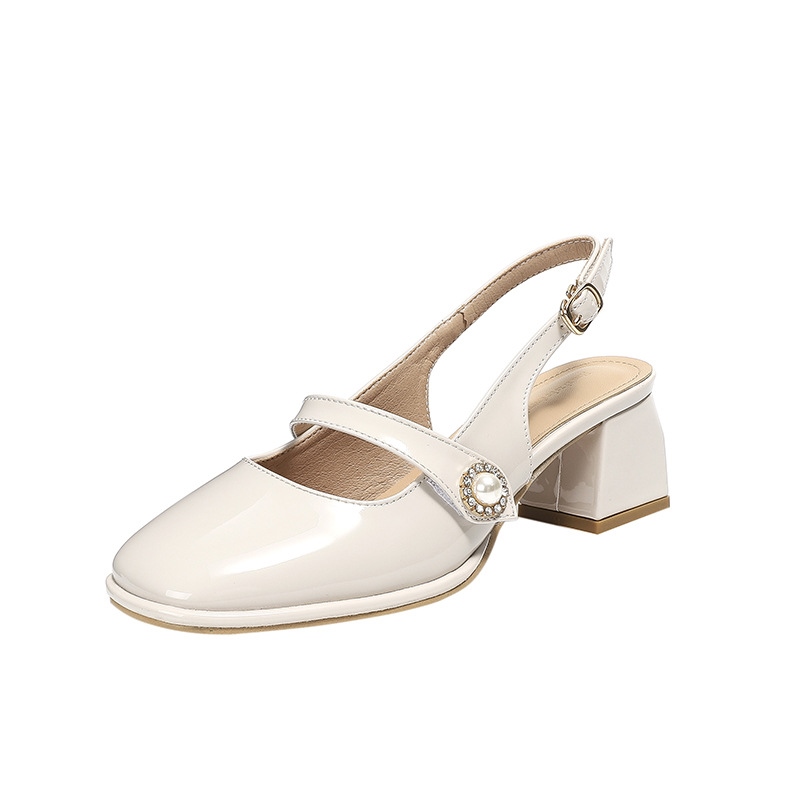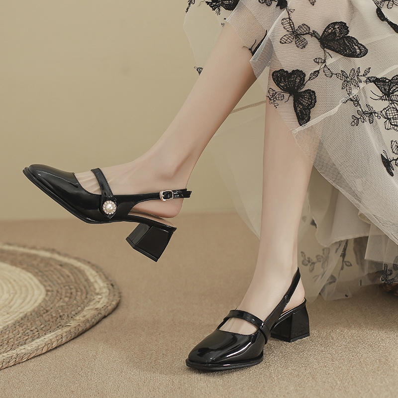 otou s women's chky heel medium heel 23 summer new patent ler fairy style one word buckle back empty high heels C427☏☜