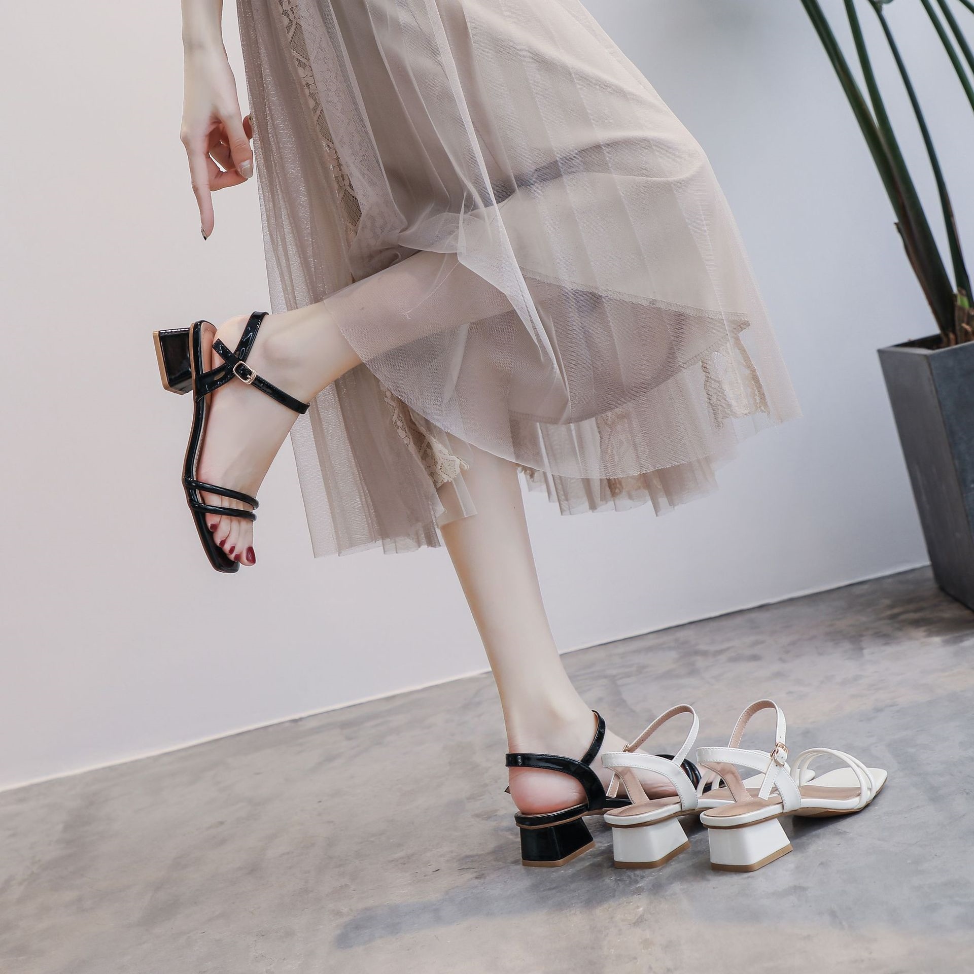 Two- otou s women's 23 summer new pnted toe one-word belt fairy style medium heel thick heel high-heeled women's shoes C427▬◄