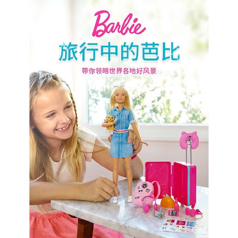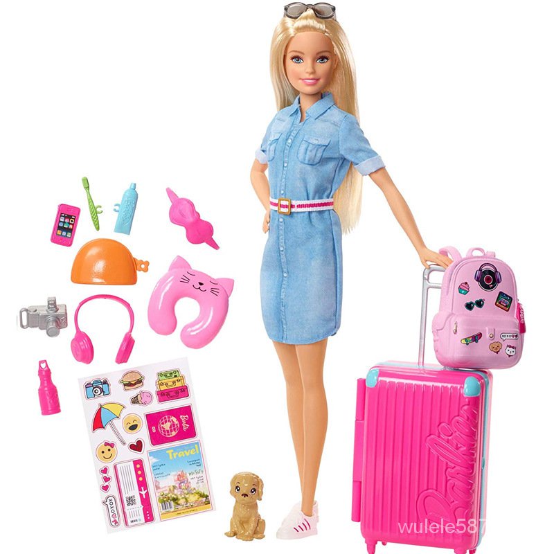 Inspired by Barbie's Dreamhouse Adventures, this set comes with so many accessories for hours of fun play. Peek into the everyday life of Barbie's exciting adventures. Includes a Barbie doll wearing fashion and shoes, a puppy and carrier, suitcase, backpack, sticker sheet and 10 travel-themed pieces. Dolls cannot stand alone.