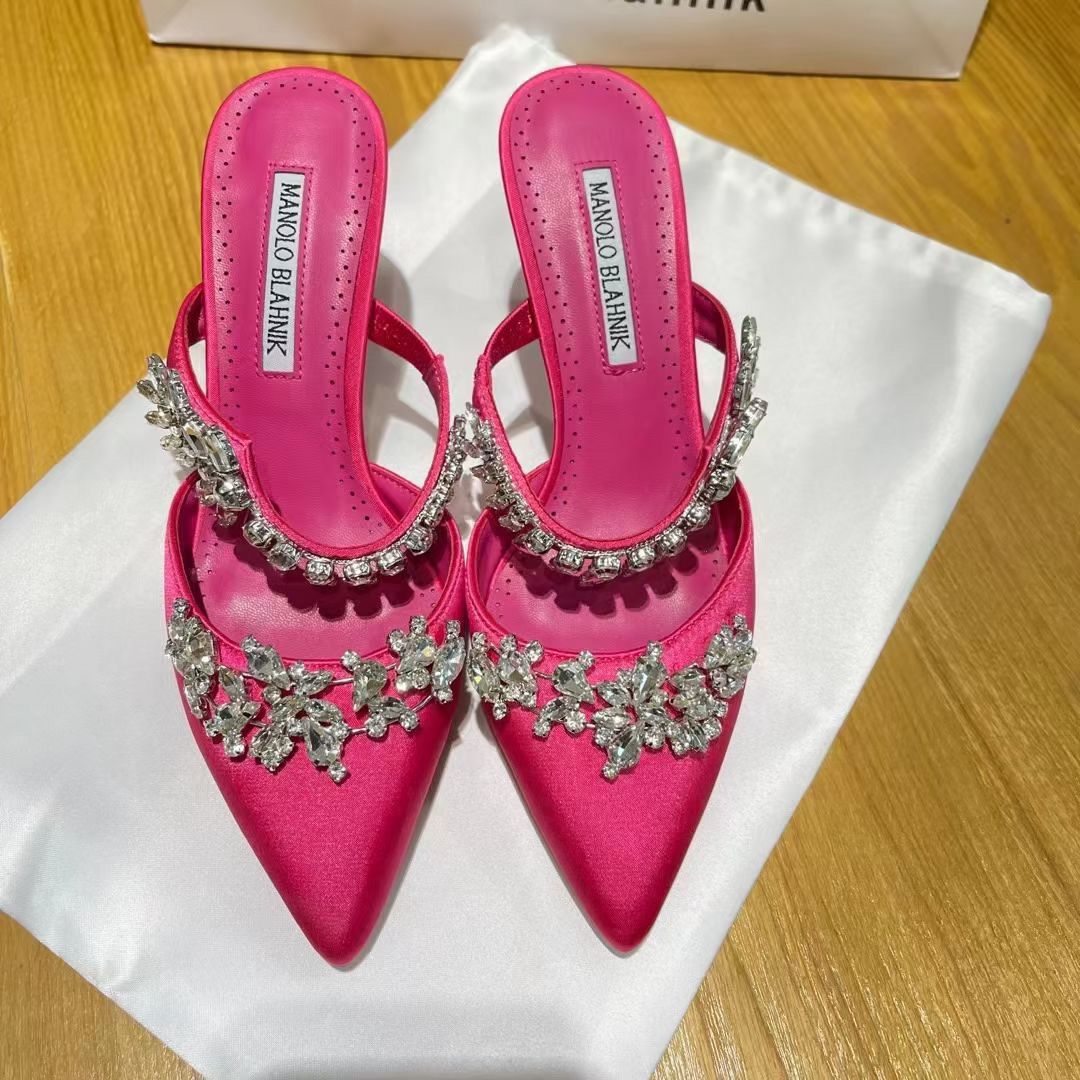 2023 summer new manolo blahnikˉflower diamond slippers Fashion pointed chain high heel sandals and slippers
