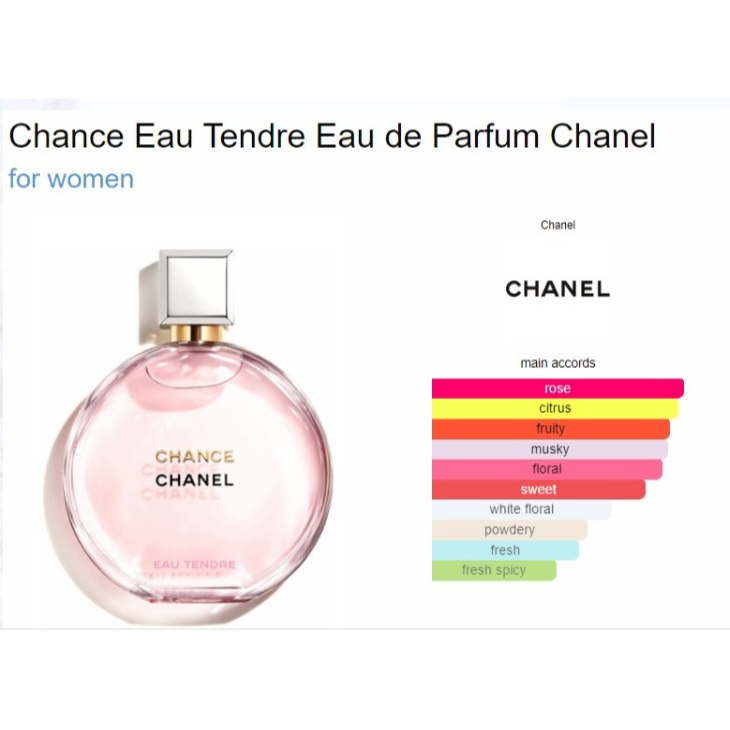Chance Eau Tendre is a Floral Fruity fragrance for women. Chance Eau Tendre was launched in . The nose behind this fragrance is Jacques Polge. Top notes are Quince and Grapefruit; middle notes are Hyacinth and Jasmine; base notes are Musk, Iris, Virginia Cedar and Amber.
