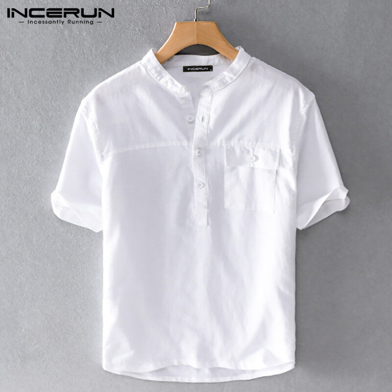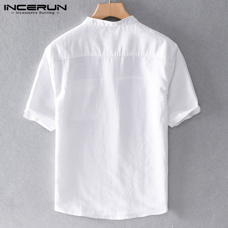 INCERUN Mens Short Sleeve Linen Shirt V Neck Causal Fit Beach Yoga Blouse (Cotton Linen)