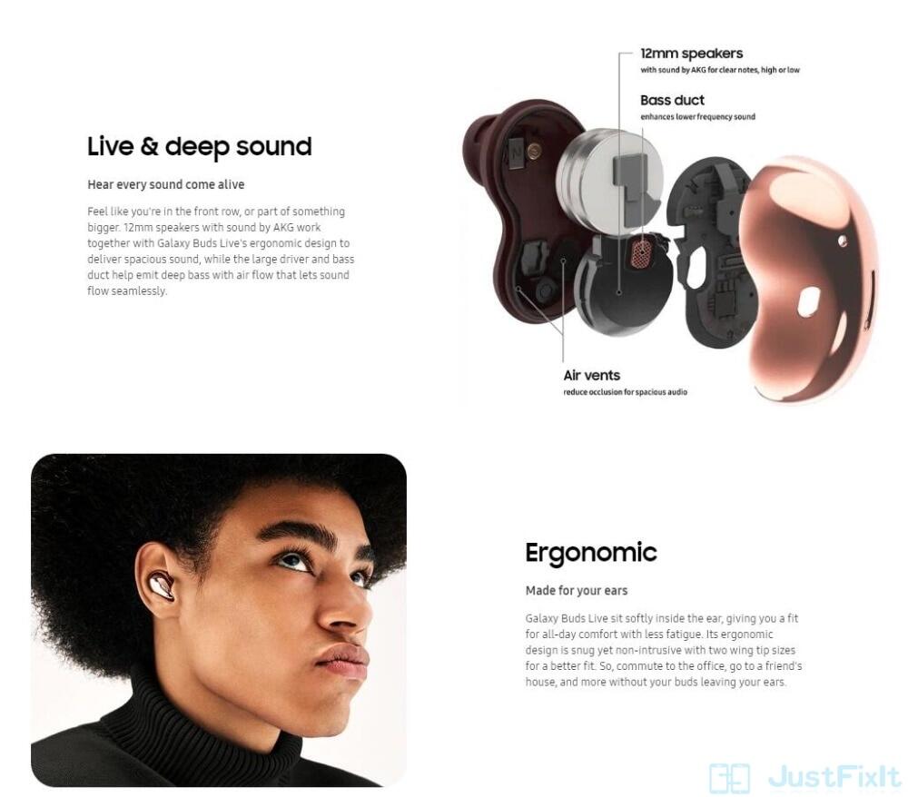 Galaxy Buds Live duduk dengan lembut di dalam telinga, memberikan anda keselesaan sepanjang hari dengan kurang keletihan. Reka bentuk ergonomiknya adalah selesa namun tidak mengganggu dengan dua saiz hujung sayap untuk lebih sesuai. Jadi, berulang-alik ke pejabat, pergi ke rumah rakan, dan banyak lagi tanpa tunas anda meninggalkan telinga anda.