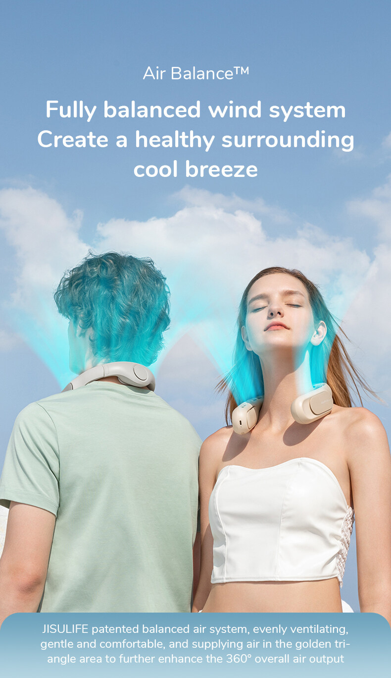 A comprehensive balanceof the wind system, remodeling ahealthycool wind. Air Balance™.Fully balanced wind system Create a healthy surrounding cool breeze. JISULIFE patented balanced air system, evenly ventilating, gentle and comfortable, and supplying air in the golden triangle area to further enhance the 360° overall air output.