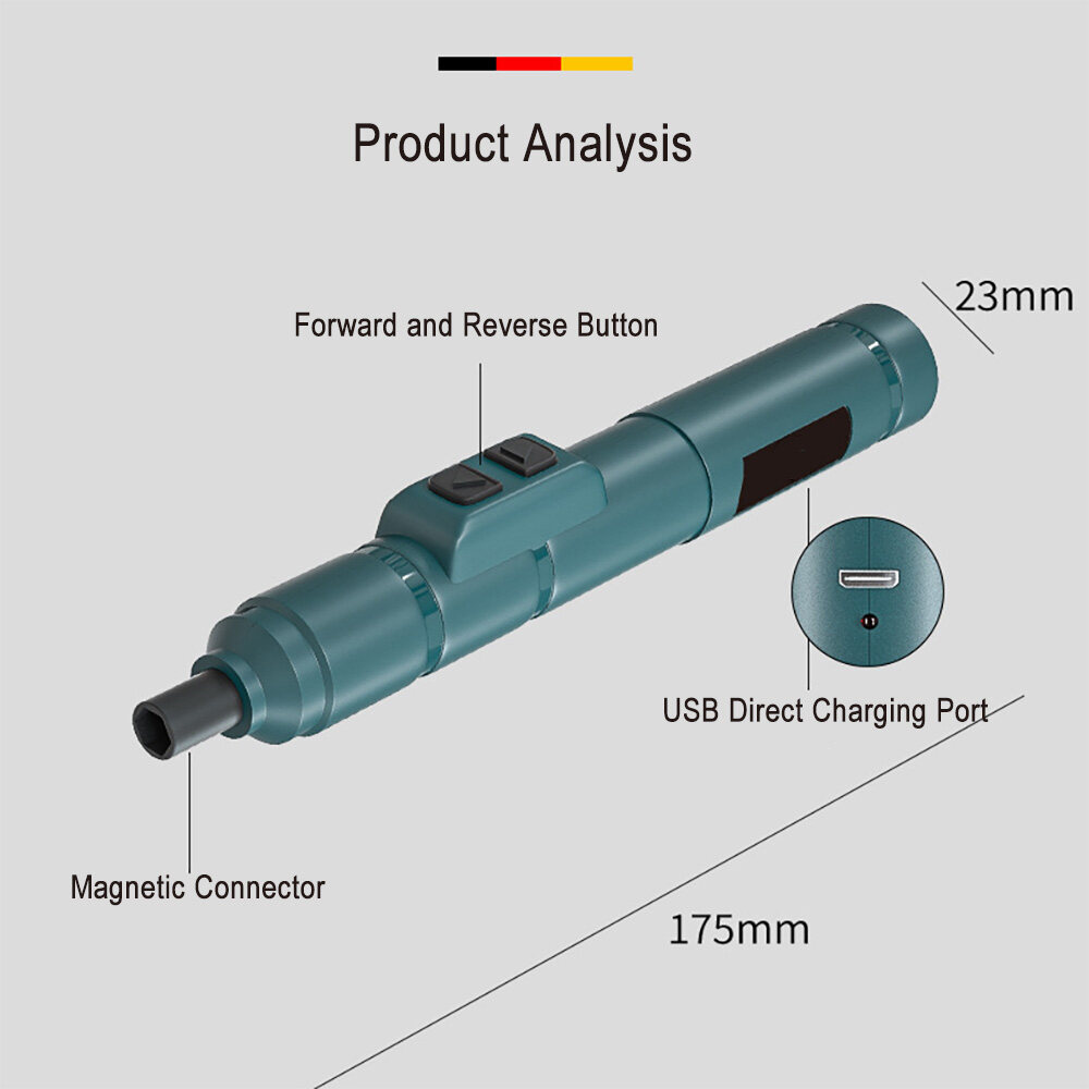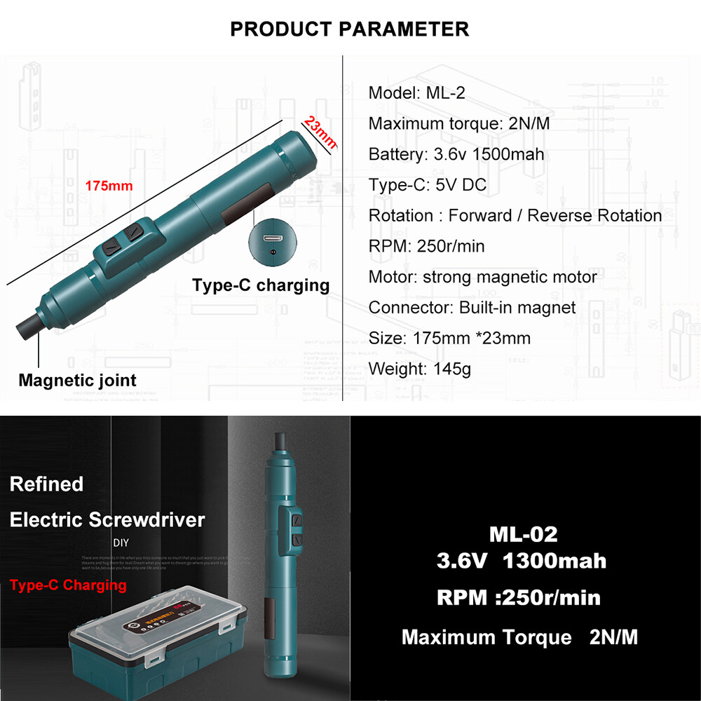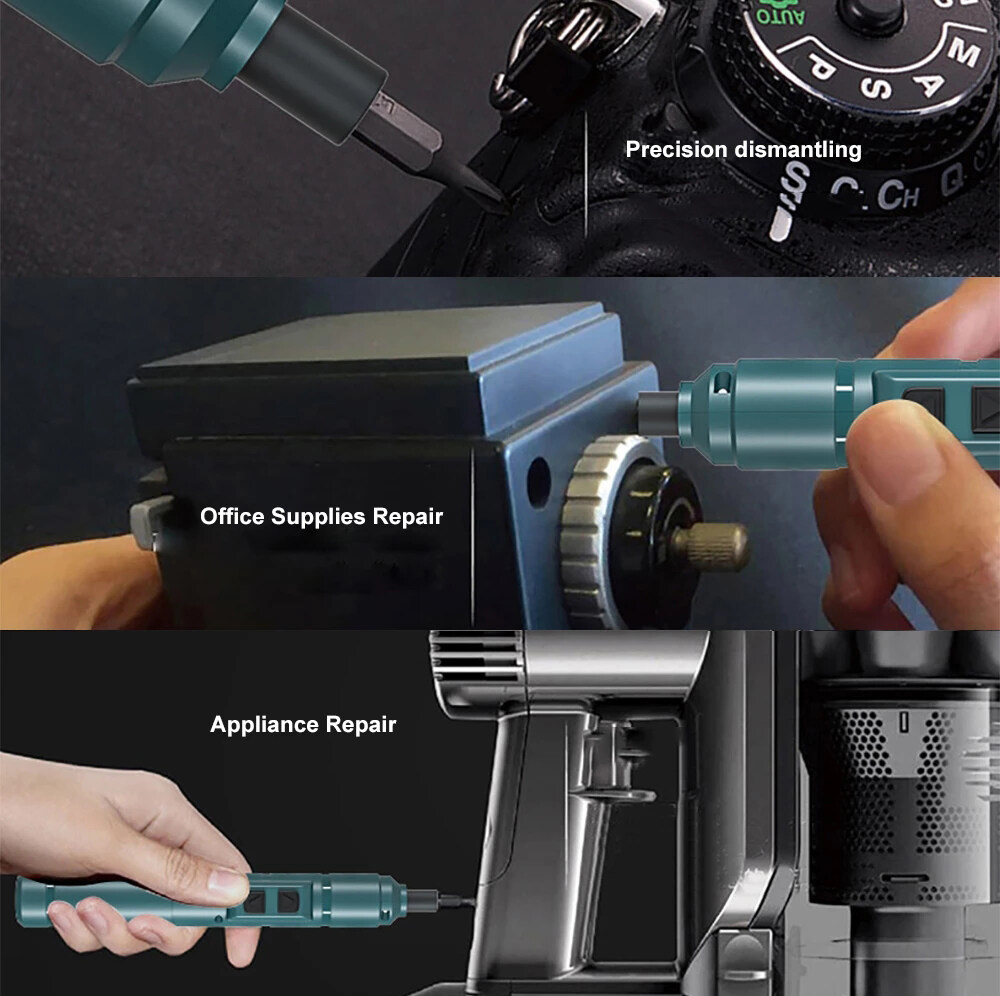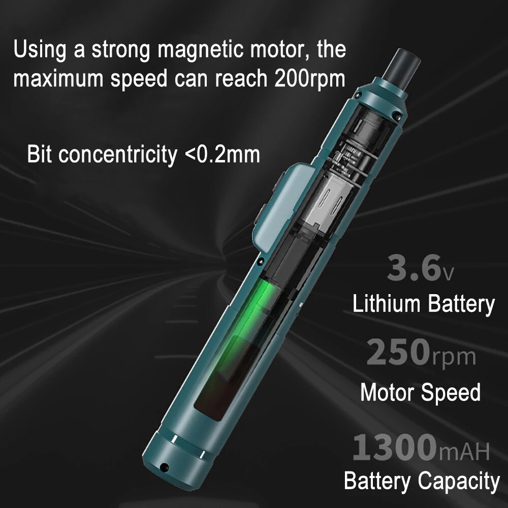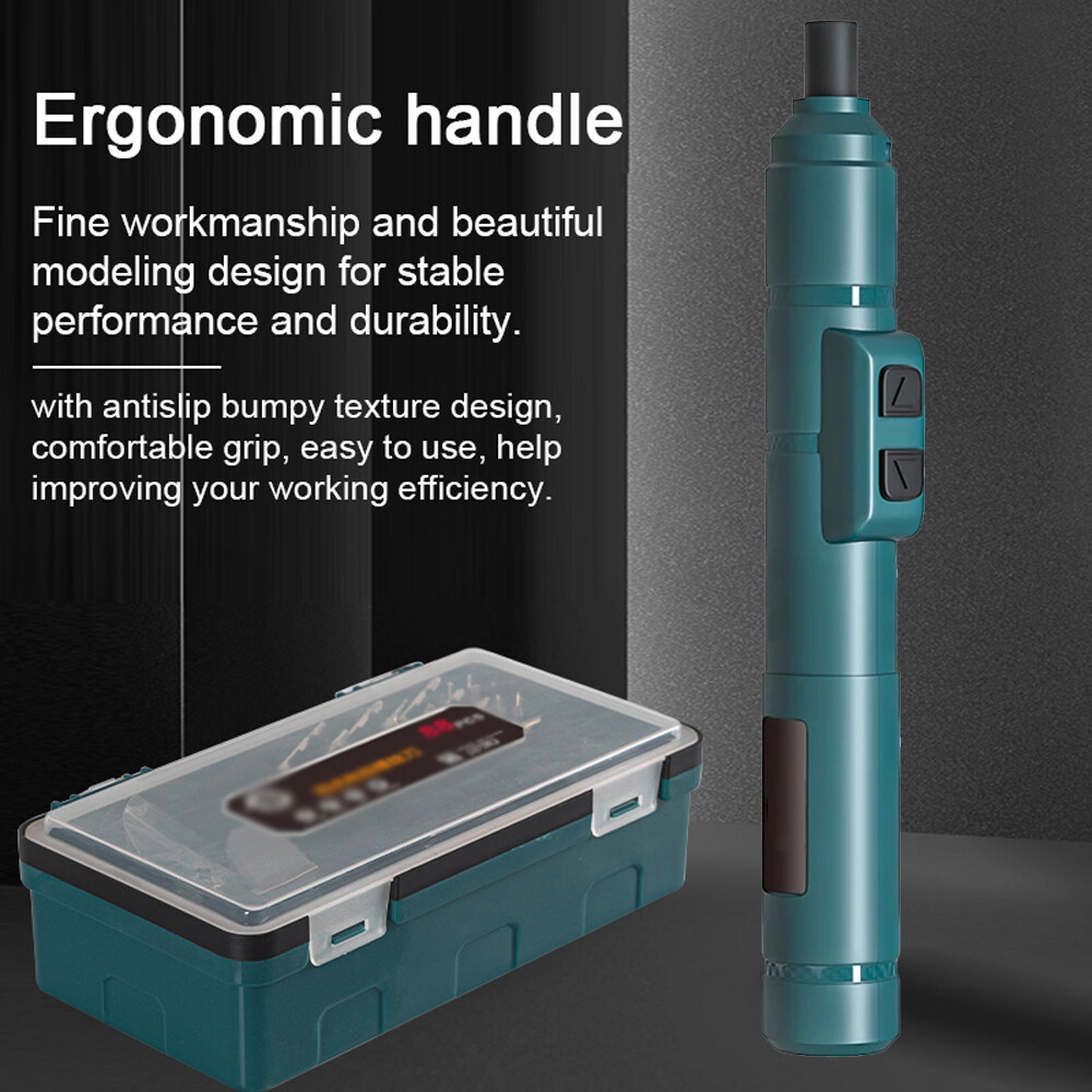This screwdriver set is manufactured with fine workmanship and precise modeling design for stable performance and durability. Adopts strong-magnetics motor, no-load speed up to 250rpm, with rotation-speed-protection function. When rotating with the all-metal ge-arbox, the concentricity of the batch head is <0.2mm, which effectively improves the working efficiency. Wide applications, suitable for repairs and maintenance of electronic products and precise instruments such as motorbike, cellphones, watches and home appliances.