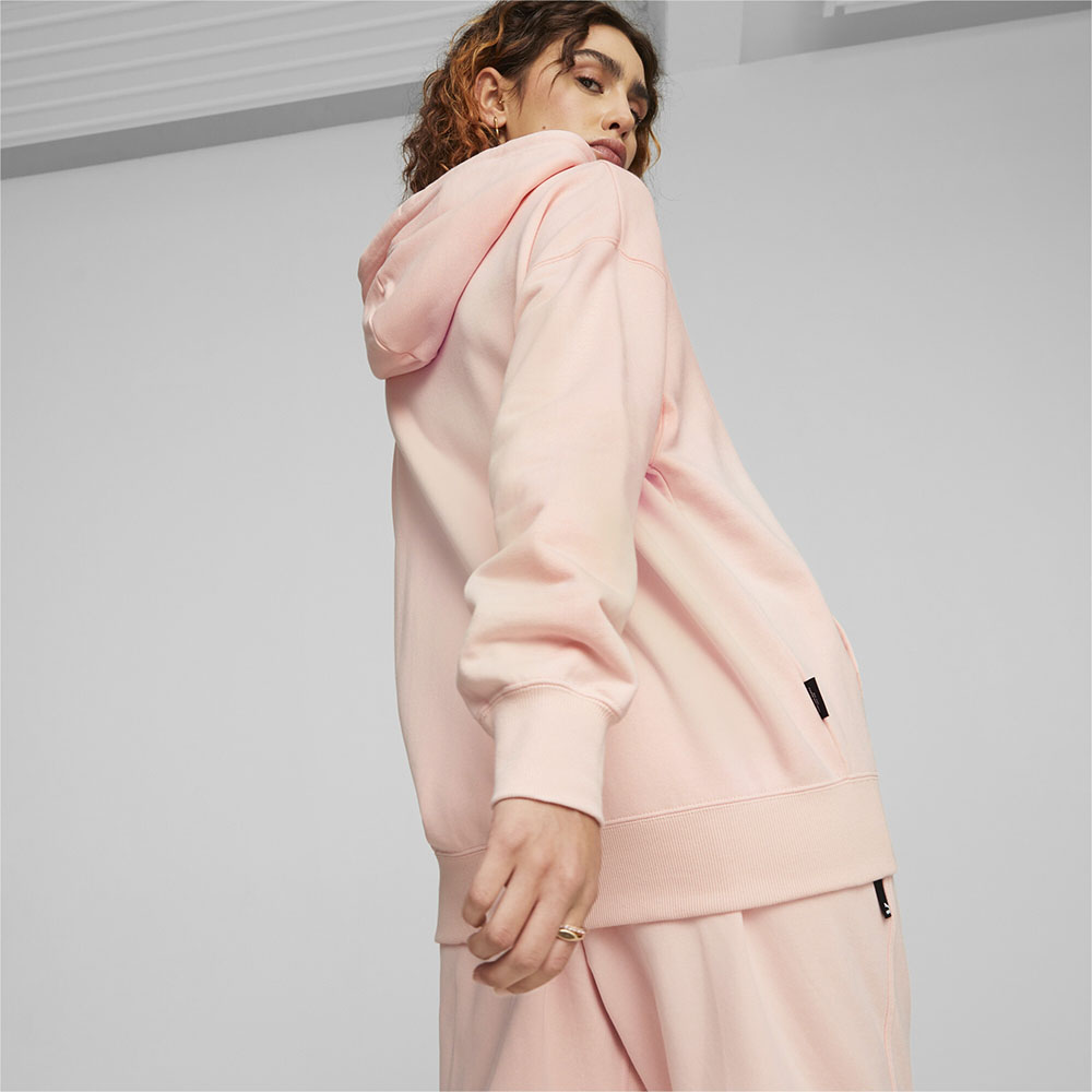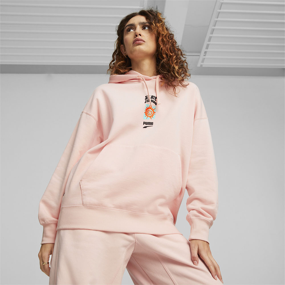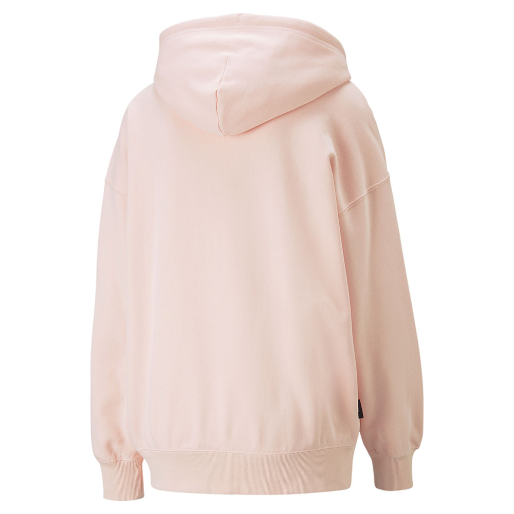 FEATURES&BENEFITS Cotton: Cotton in PUMA products come from farms with a focus on sustainable farming such as water efficiency and soil health protection Recycled Content: Made with at least 20% recycled material as a step forward a better future DESAILS Oversized FitFrench terry jerseyHood with drawstringKangaroo pocket Ribbed cups and hemPUMA branding and collection graphic on chestPUMA Archive No.1 woven label