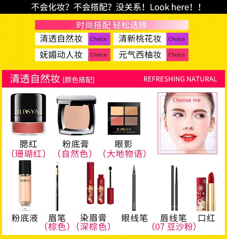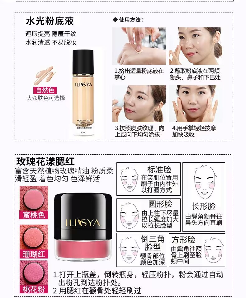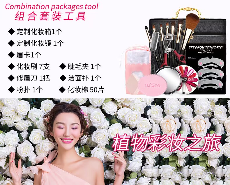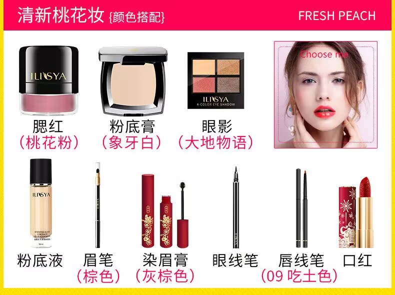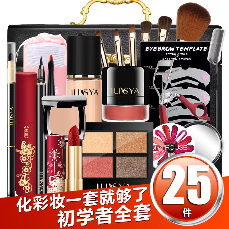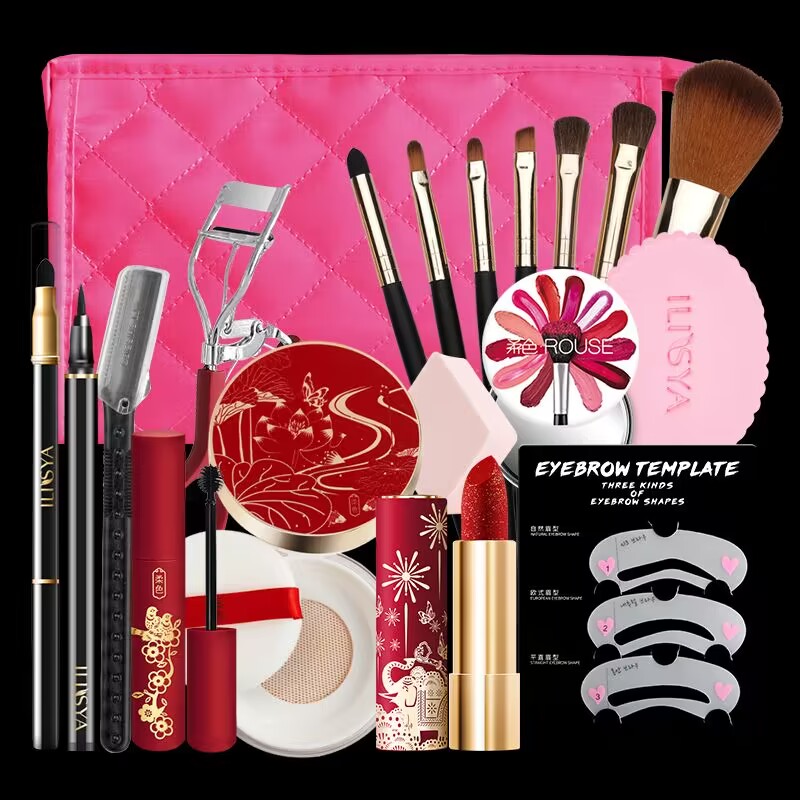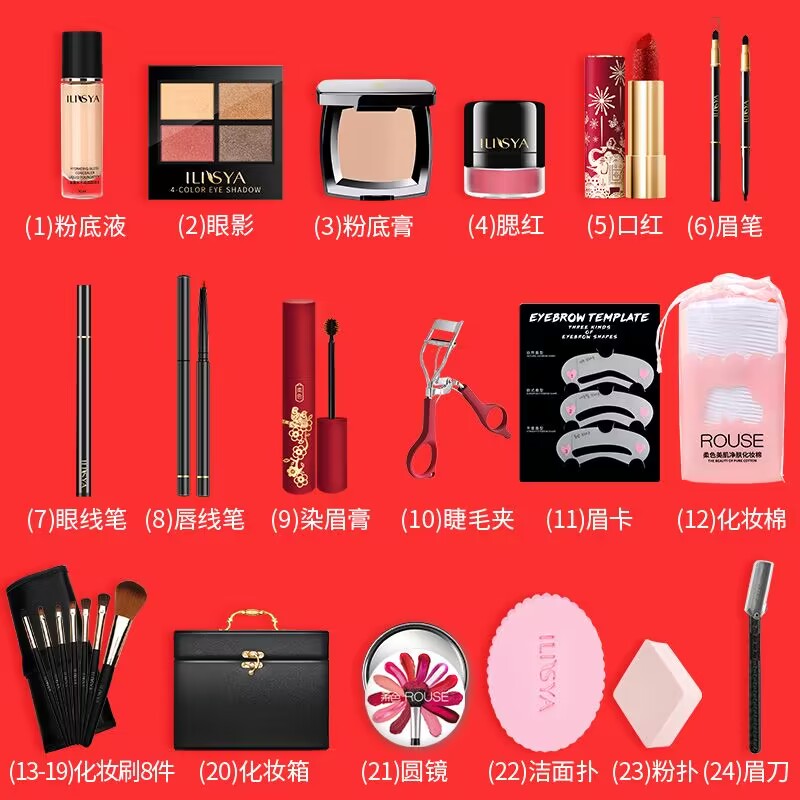 Items included: Compact powder, Liquid foundation, Blusher, Eyeshadow, Eyeliner liquid, Eyeliner pencil, Lipgloss, Lipstick, Mascara