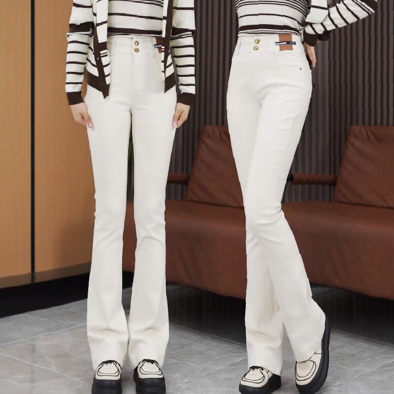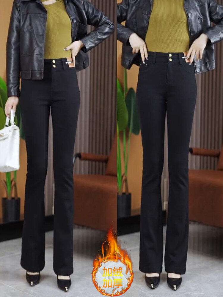 Fleece-Lined Thick High Waist Denim Bootcut Trousers Women's 2023 Winter New Fashion All-Match Slim and Tall Looking Horn Long Pants