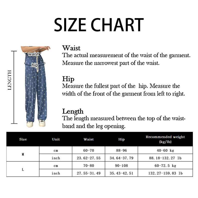 Features:Women's Casual Fashion Loose High Waist Wide Leg Denim Pants Size:M-L Color:Big Letter, Small Flower, GD, Symmetric, Aut, Solid, Cross Material: Ice silk Package Includes:a pc Pants Size: please allow 1-2cm differs due to manual measurement, thanks. Note: Due to the difference between different monitors, the picture may not reflect the actual color of the item. We guarantee the style is the same as shown in the pictures, but not the same performance on different bodies as on the model. Thank you!