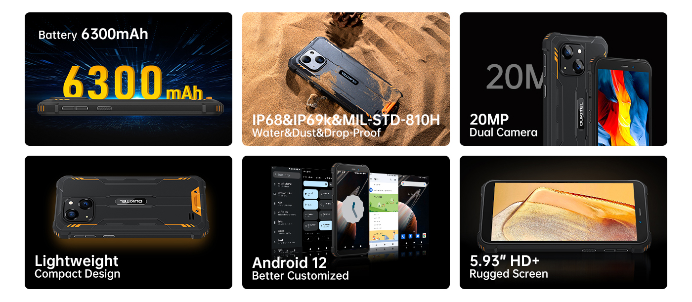 Battery:6300mAh/Dual Cameras:20MP/5.93" HD+ Rugged Screen/Android 12/Lightweight Compact Design