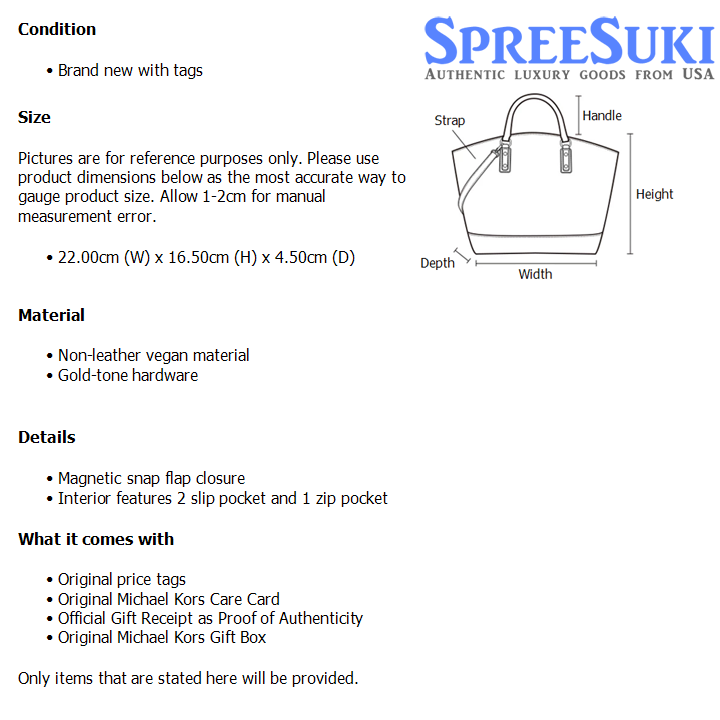 All our products are 100% authentic and purchased from Michael Kors stores in USA. We are a reputable registered business in Singapore and it is illegal to sell counterfeit goods in Singapore. This product also comes with a gift receipt which is printed by the Michael Kors store that we purchased the item from. It states the item that we purchased and the Michael Kors store that it was purchased from, proving the authenticity of the item. Buy with confidence.