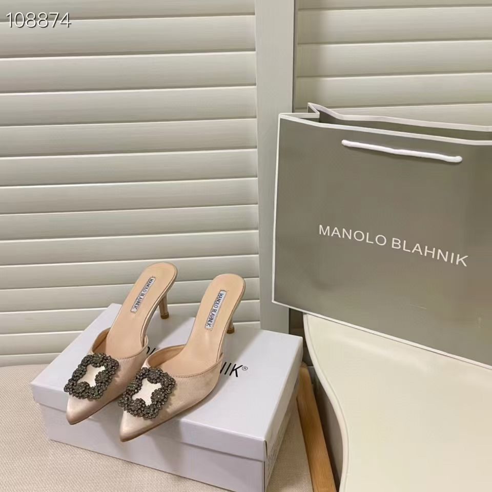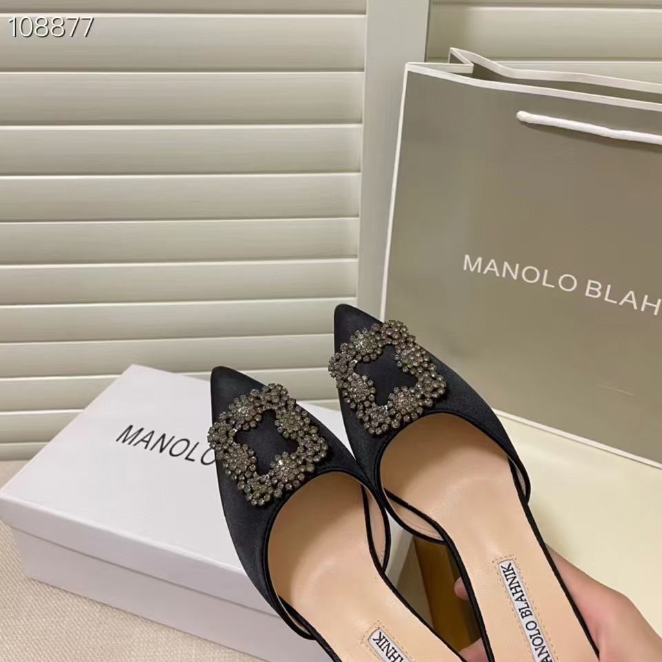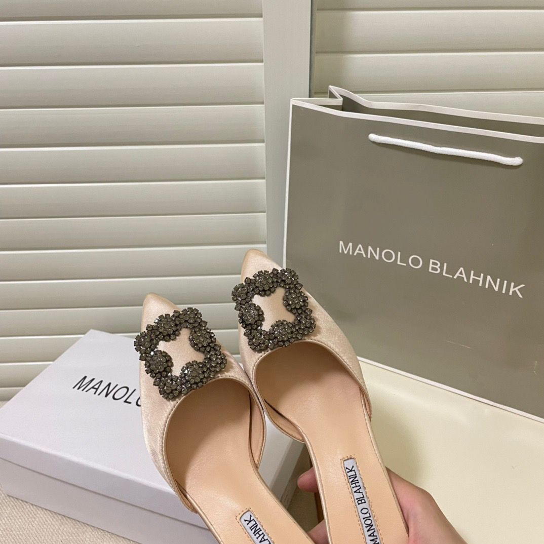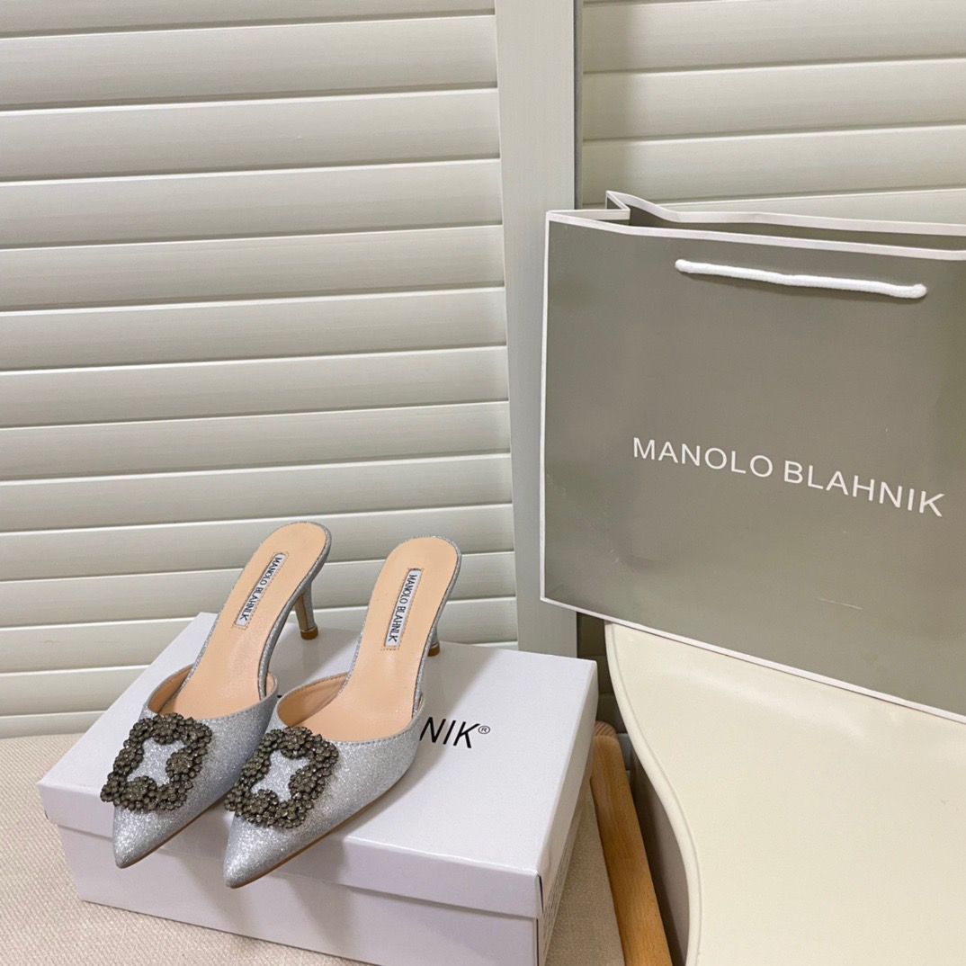 2023 Summer and Autumn New manolo blahnikˉDiamond Slippers European and American Fashion Pointed Toe Square Buckle High Heel Half Slippers
