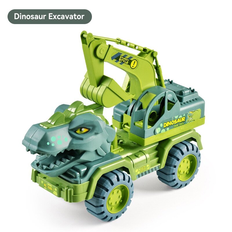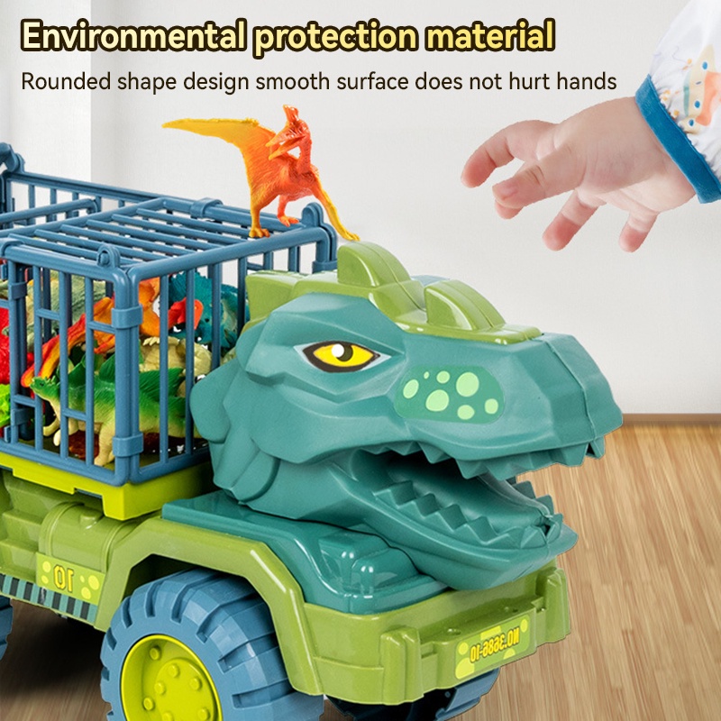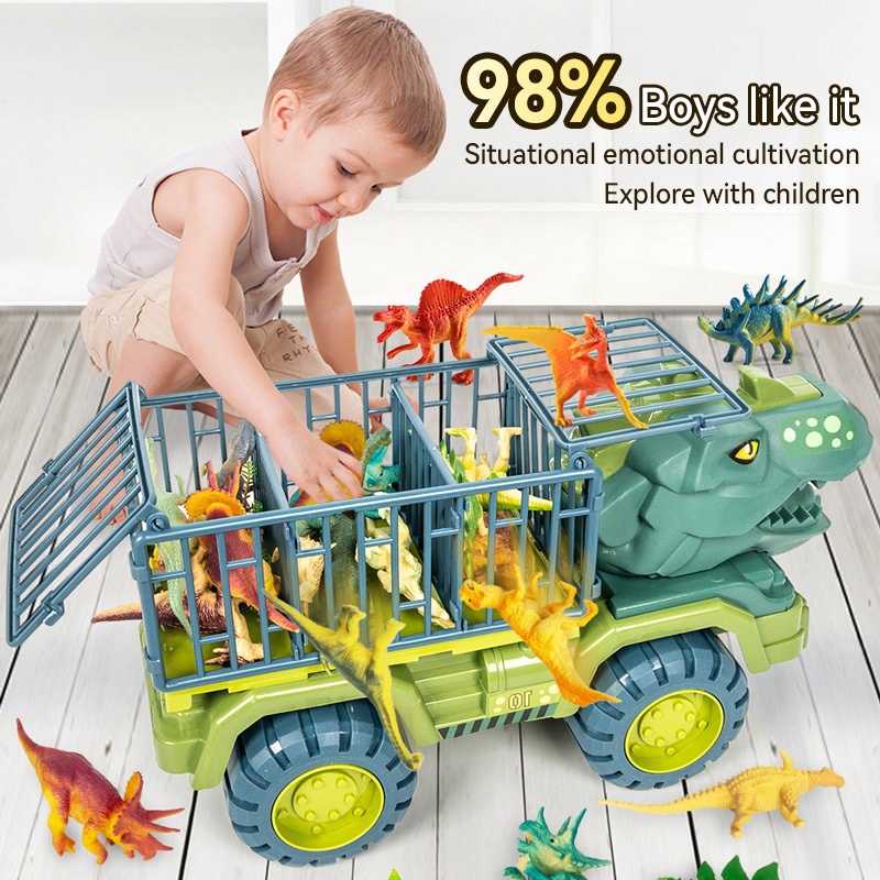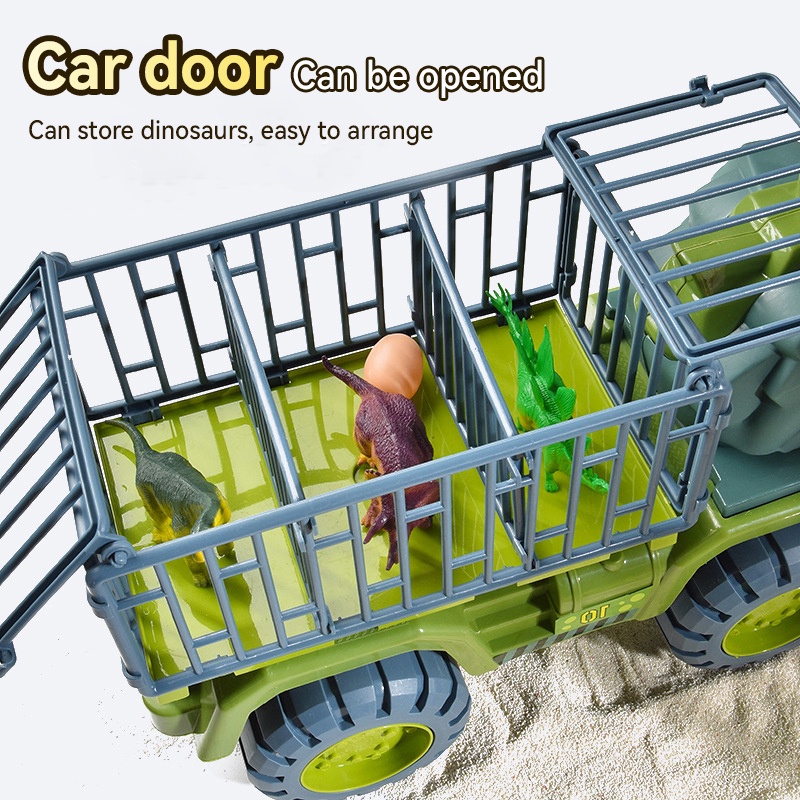 【Large Monster Truck Playset】- Includes a giant T-Rex head monster truck with 4 large size wheels and a large openable fence, 12 realistic dinosaur figures, a tree, a dinosaur egg. It is very convenient to store all subjects on the fence after playing.
